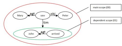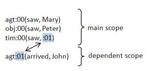 - and(agt([a];[b]);agt([a];[c])) - a semantic relation "and" between the semantic relations agt([a];[b]) AND agt([a];[c])